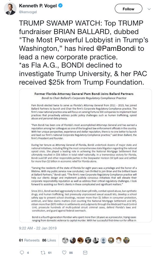 Former Florida AG who declined to investigate Trump University, Pam Bondi, was just hired by Trump fundraiser Brian Ballard, via Kenneth Vogel of The New York Times