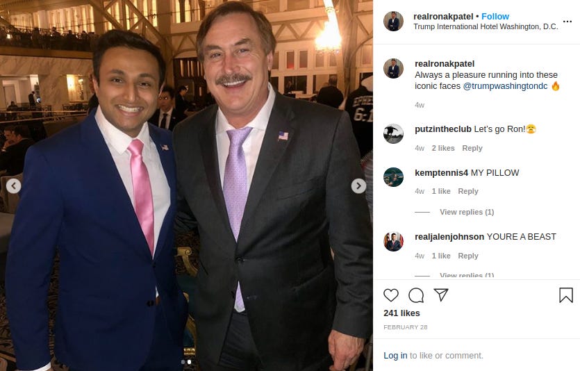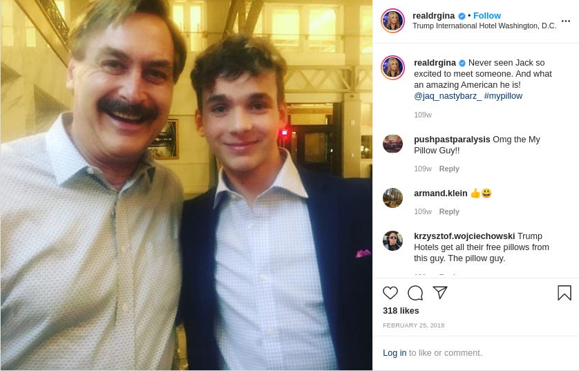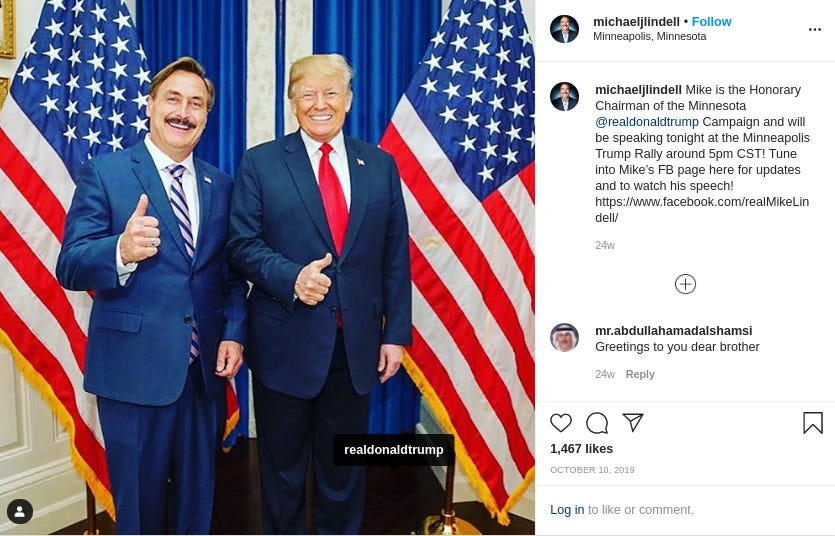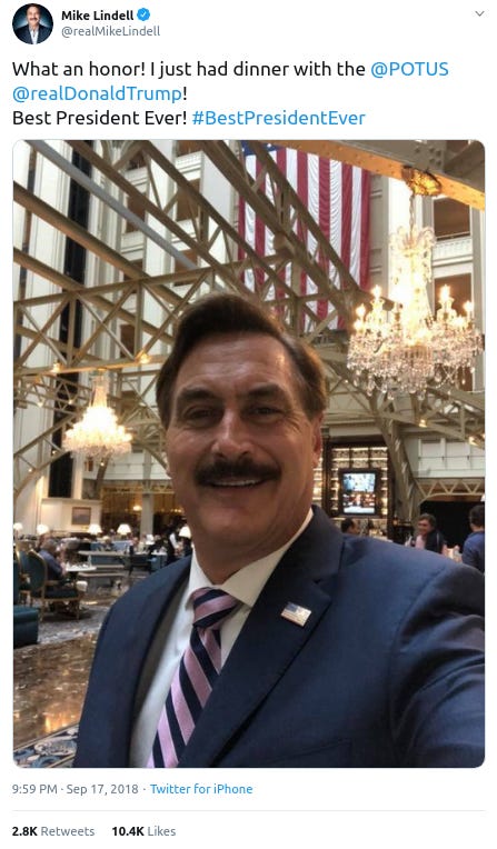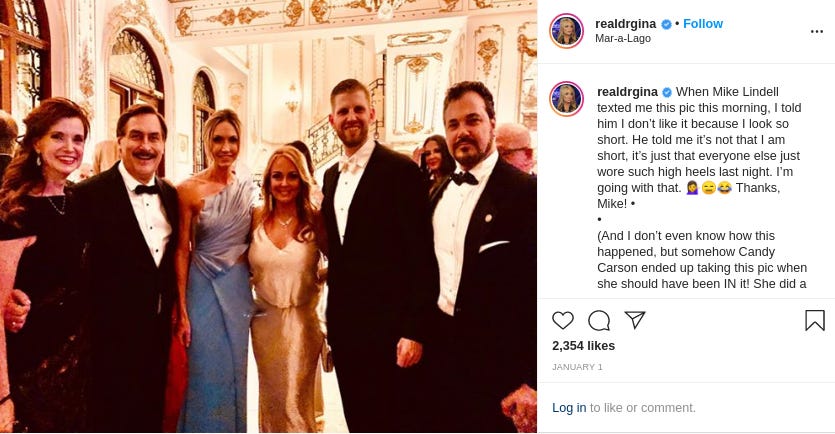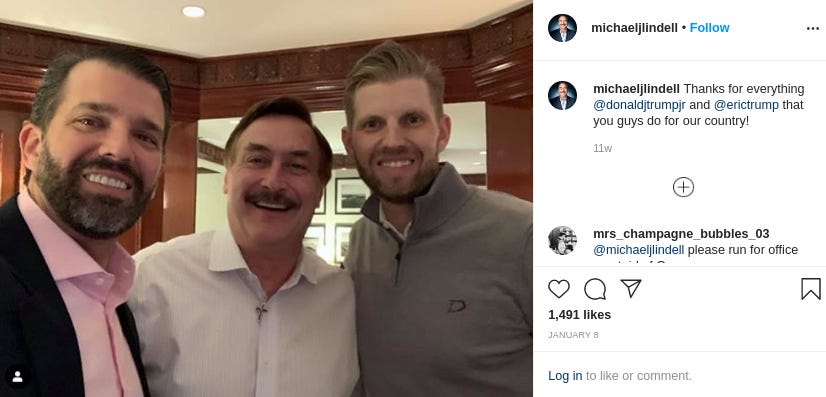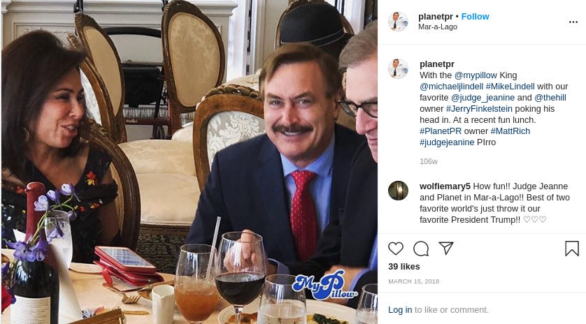 And like an extravagant chandelier, Lindell’s a fixture at Mar-a-Lago, the Trump Hotel D.C., and other Trump properties. Some samples from his social media and those of people eager to land a selfie with the celebrated infomercial host—