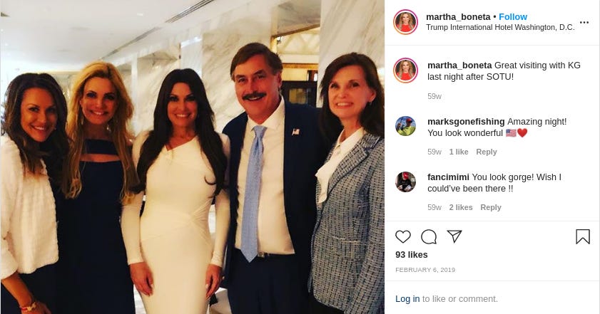 At the Trump Hotel D.C. after the State of the Union in February 2019, with adviser for pro-Trump nonprofit America First Policies and lobbyist for a Kuwaiti firm Martha Boneta and Trump Victory finance chair Kimberly Guilfoyle