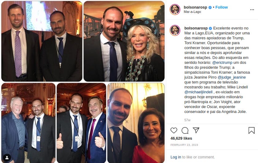 At Mar-a-Lago in February 2019 celebrating Trump with a member of Brazil’s Congress and the son of the country’s president, Jair Bolsonaro, Eduardo Bolsonaro