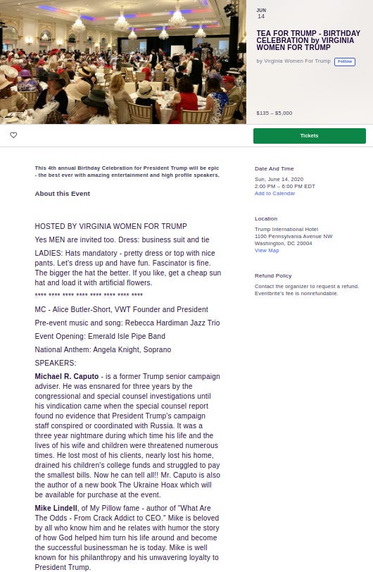 Listed as a speaker at Tea for Trump at the Trump Hotel D.C. in June 2020