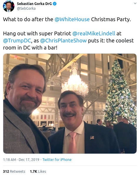At the Trump Hotel D.C. after a White House holiday party in December 2019 with former Trump White House staffer Sebastian Gorka, PhD
