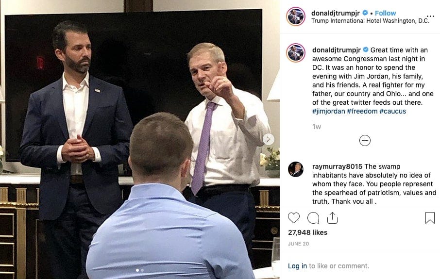 Rep. Jim Jordan’s (R–OH) campaign has reported spending $22,459.68 at the Trump Hotel D.C. Jordan held a fundraiser there earlier in June, criticized a General Services Administration inspector general’s report that questioned the agency’s handling of the hotel’s lease, let Capital One know he was concerned about his colleagues’ request for Trump Organization financial documents, came to the hotel’s defense during an Oversight Committee hearing on D.C. statehood, and has been seen at the hotel on other occasions. (Also, a PAC paid Trump Hotel Chicago almost $4,000 to host a lunch Jordan headlined.)