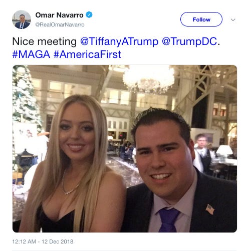 Republican Omar Navarro, whose campaign spent more than $11,000 at Trump properties in his unsuccessful attempt to unseat Maxine Waters, met Tiffany Trump.