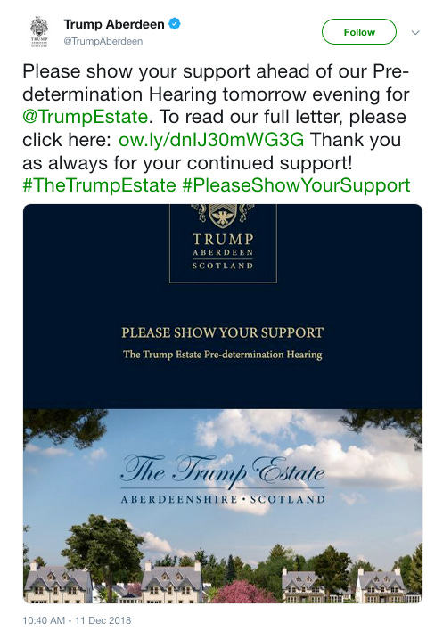 The money-losing Trump Aberdeen golf course is seeking a public show of support for its plans to build “luxurious residential cottages, townhouses and mansion homes, further five-star hotel lodges and accommodation, new resort leisure facilities including a sports centre, retail units and other amenities.” Read the entire letter.