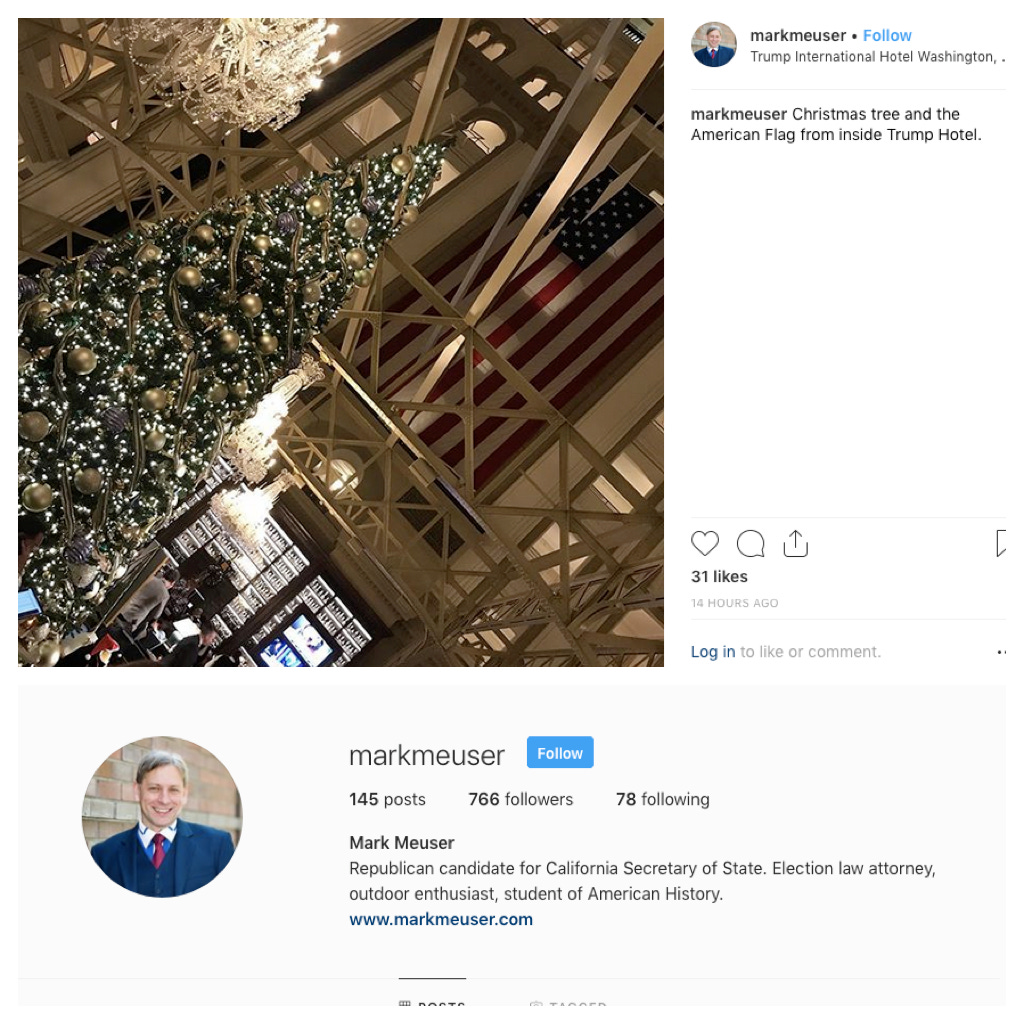 The GOP’s unsuccessful 2018 candidate for secretary of state in California, Mark Meuser, noted the juxtaposition of the hotel’s Christmas tree and American flag.