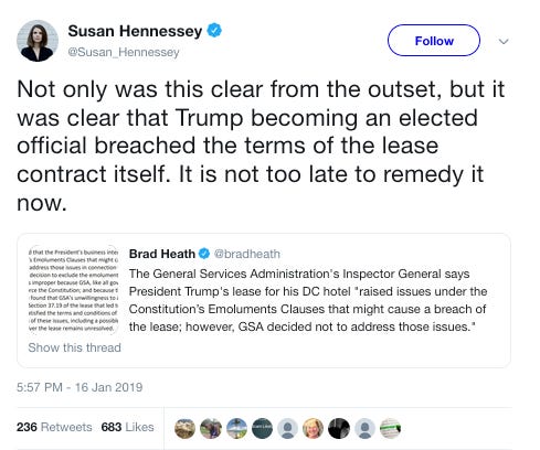 As for section 37.19, variations of it were used on previous government leases (for The Willard Hotel and The Hotel Monaco in D.C.). Additionally, “GSA did not consider Section 37.19 a material term of the OPO lease, and it was not discussed during lease negotiations,” per the IG report. After Trump’s election—and media outlets pointed out that he could now be in violation of the lease [support journalism!]—GSA attorneys started reviewing the lease. Terry, meanwhile “immediately formed an opinion, based on his ‘plain reading’ of Section 37.19, that there was no breach.”