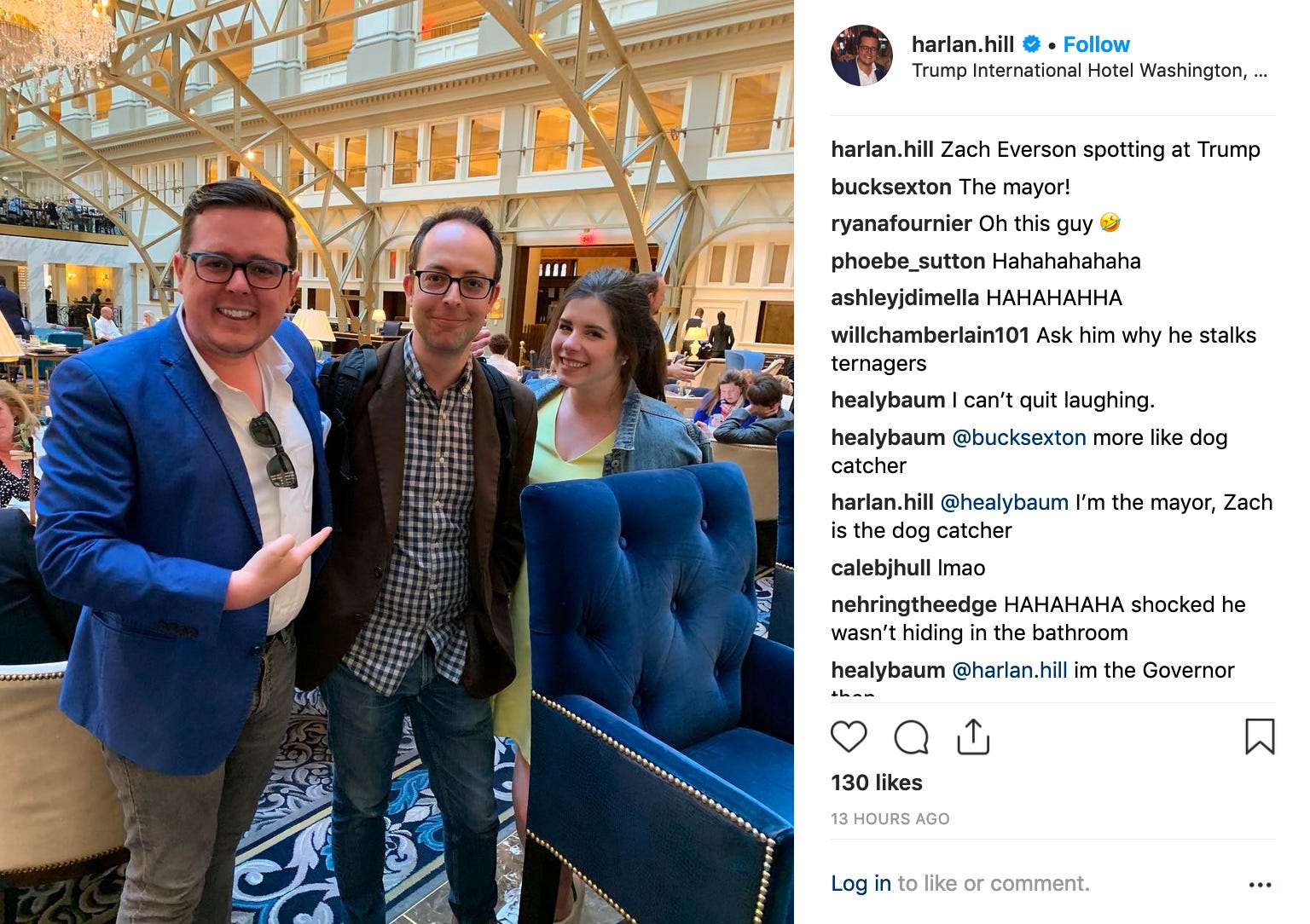 Political consultant, Fox News pundit, and Trump campaign advisory board member Harlan Hill posed with, uh, me, and public-affairs specialist Sarah Selip. (Fun fact: The one person in this photo who’s not a Trump Hotel D.C. regular is the guy who publishes a daily newsletter about the place.)