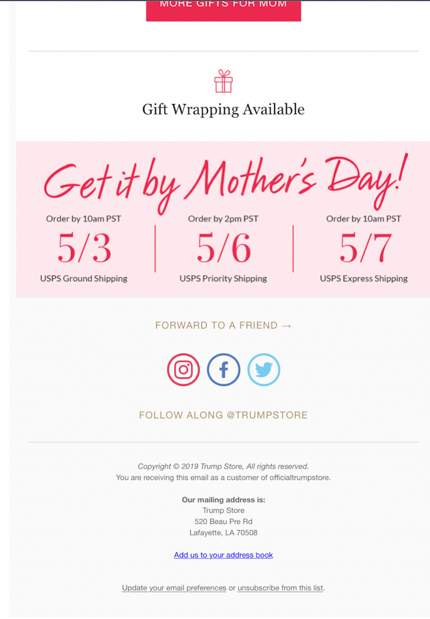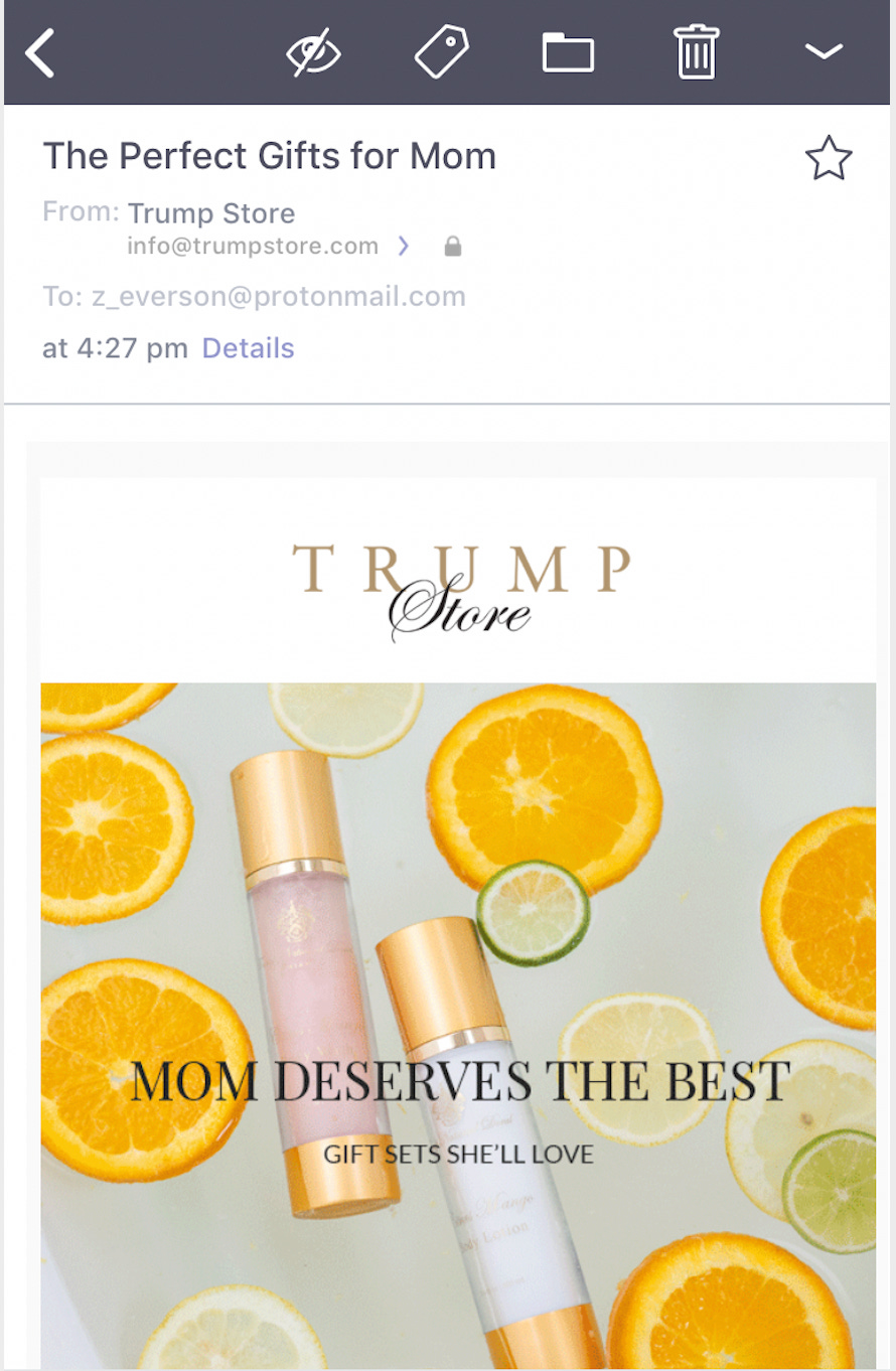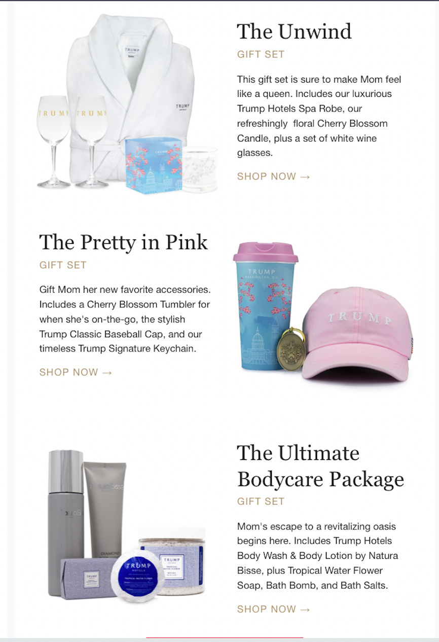 Per a marketing email sent yesterday, the Trump Store thinks Trump-branded merchandise that shows the White House is a perfect way to celebrate your mother. The unwind and the pretty in pink packages it promoted both contain products showing the head of the Trump Organization’s current residence. According to the Trump Store’s website, the pretty in pink set has sold out.