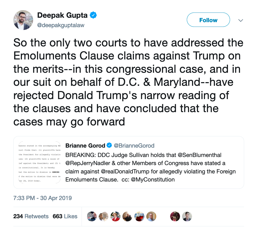 Deepak Gupta, an attorney who argued CREW’s appeal and has worked with the D.C. and Maryland AGs, remarked that judges in two of the suits have interpreted “emoluments” broadly. That’s noteworthy as there’s little legal precedent regarding the emoluments clauses.