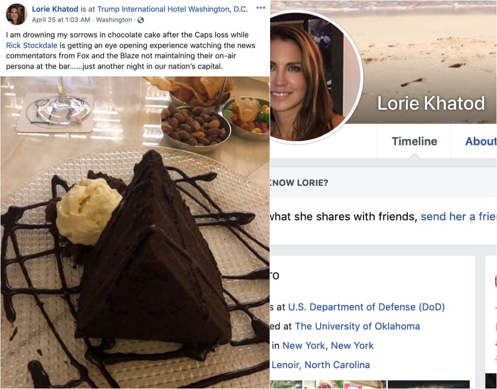 Department of Defense staffer Lorie Khatod drowned her sorrows in chocolate cake at the commander-in-chief’s hotel.