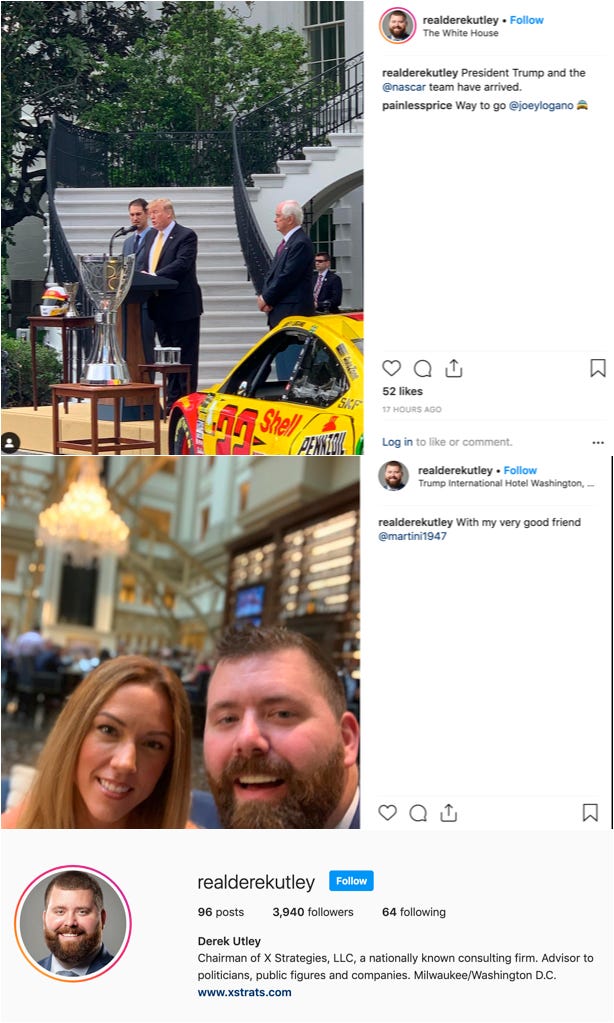 An “advisor to politicians, public figures, and companies,” Derek Utley of X Strategies, LLC, appeared to follow up a White House visit with a trip to the president’s hotel down the street.
