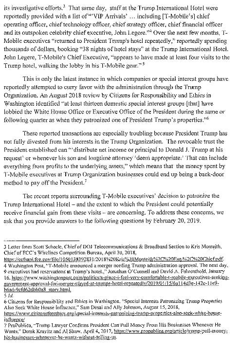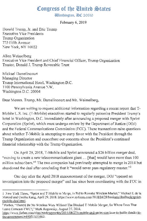 The revelations come as political scrutiny of the proposed deal is mounting on Capitol Hill. On Wednesday, Sen. Elizabeth Warren (D-Mass.) and Rep. Pramila Jayapal (D-Wash.) issued letters demanding information about the T-Mobile executives’ stays and whether Trump was informed of them. The issue is likely to come up at House subcommittee hearings on the merger next week.