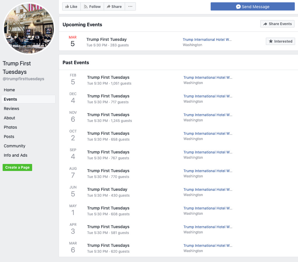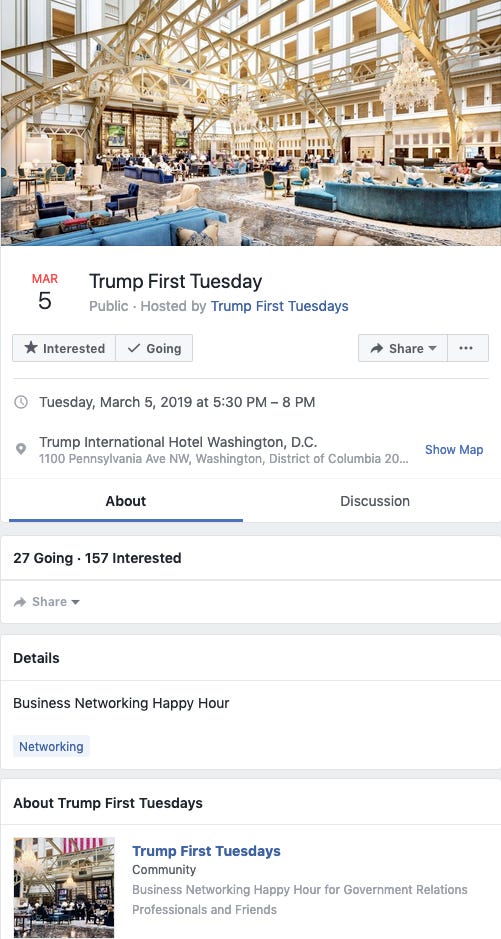 The next Trump First Tuesday, a “business networking happy hour for government relations professionals [lobbyists] and friends” has been scheduled for March 5. It’ll mark one year of Trump First Tuesdays; according to the group’s Facebook Page, its first event was in March 2018. Trump First Tuesdays has brought lobbyists to the Trump Hotel D.C. every month thereafter, other than July 2018 (when the first Tuesday was the day before the Fourth of July) and January 2019 (when it fell on New Year’s Day).