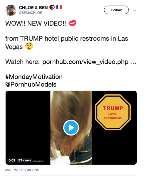 Verified Pornhub amateurs “Ben in Chloe” [sic?] posted a video they claim was shot in a public restroom at the Trump Hotel Las Vegas. No Trump amenities were seen though, so 1100 Pennsylvania was unable to independently verify this claim. If legit, they’d be the third adult performers to promote a video in recent weeks shot at a Trump property, joining Candie Cane and Katrina Blacked.