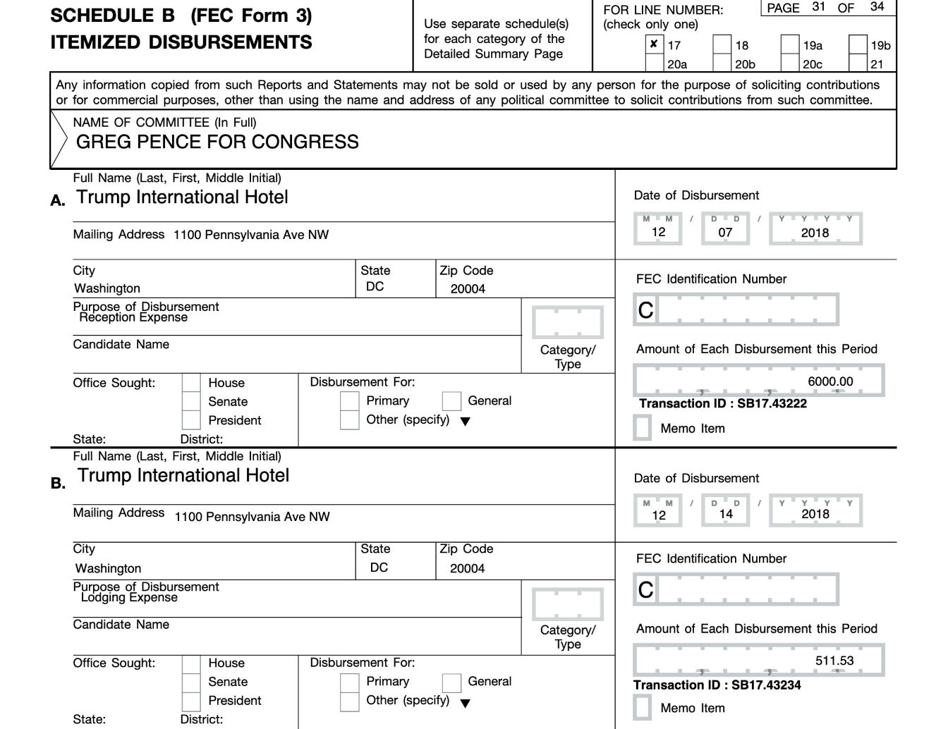The campaign for Rep. Greg Pence (R–IN) spent another $6,511.53 at the Trump Hotel D.C. in December 2018 for a reception and lodging. The vice president’s younger brother’s campaign has now spent $30,555.88 at the president’s D.C. hotel.