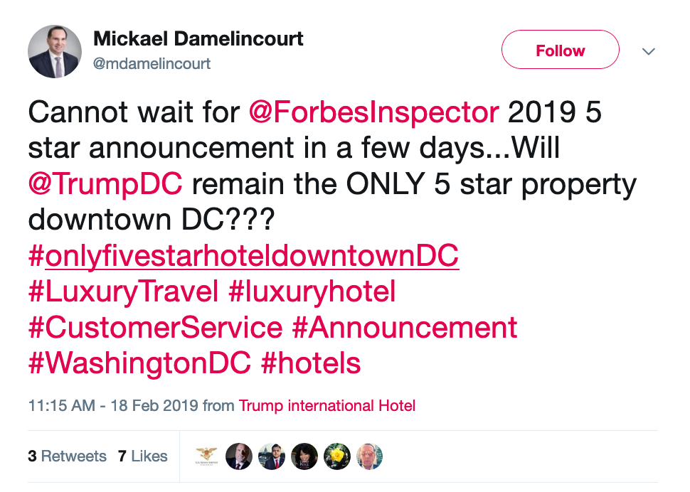 Trump Hotel D.C. managing director Mickael Damelincourt seems confident his property will retain its Forbes five-star status: