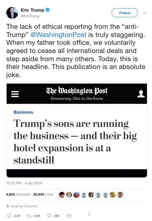 Trump Org EVP Eric Trump did not like The Washington Post’s article on the company’s halted expansion plans.