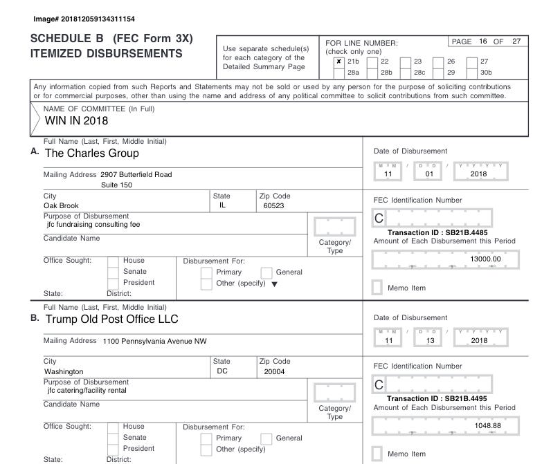 Win in 2018, a joint-fundraising committee for 14 state Republican parties, spent $7,154.88 at the president’s hotel on catering and facility rental over two dates in October and November 2018.