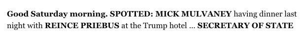 Politico Playbook spotted acting chief of staff Mick Mulvaney dining with former chief of staff Reince Preibus at their current and former boss’s hotel.