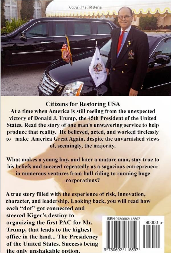 In fact, the sole occasion where Kiger attempted to monetize his access, was when he used a photo of him standing by the presidential limousine on the back cover of his self-published memoir, From Poverty to Polo To Politics: A Life Leading to Trump.