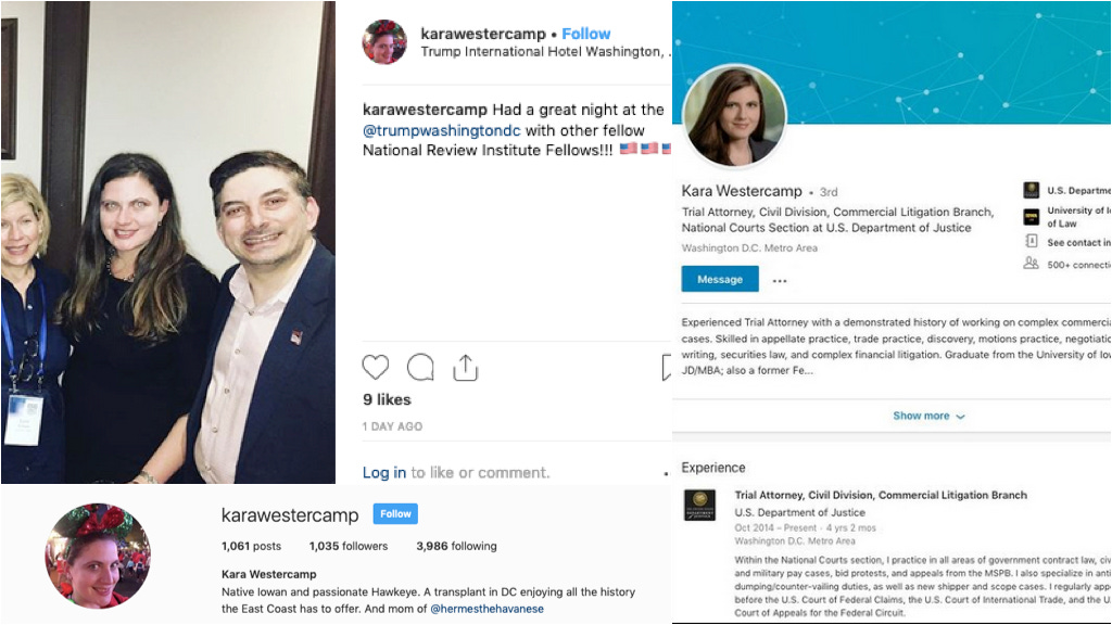 Kara Westercamp attended the National Review Institute’s discussion. As of November 2018, Westercamp was a trial attorney at the U.S. Department of Justice. Her LinkedIn profile disappeared after details about her previous visits to the president’s hotel were FOIA’d. Also, she did not like being asked if she was at the president’s hotel on the taxpayer’s dime.