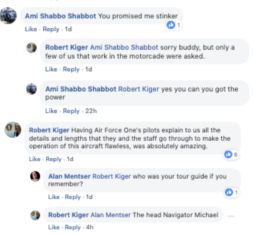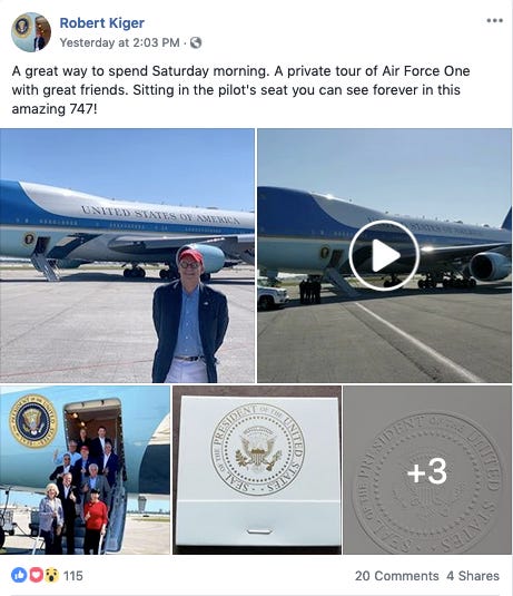 And among photos of President Trump addressing a gathering of Republicans, oversized floral arrangements, and dinners with fancy china are pictures and videos showing Kiger serving in the president’s motorcade drive team and enjoying a private tour of Air Force One.