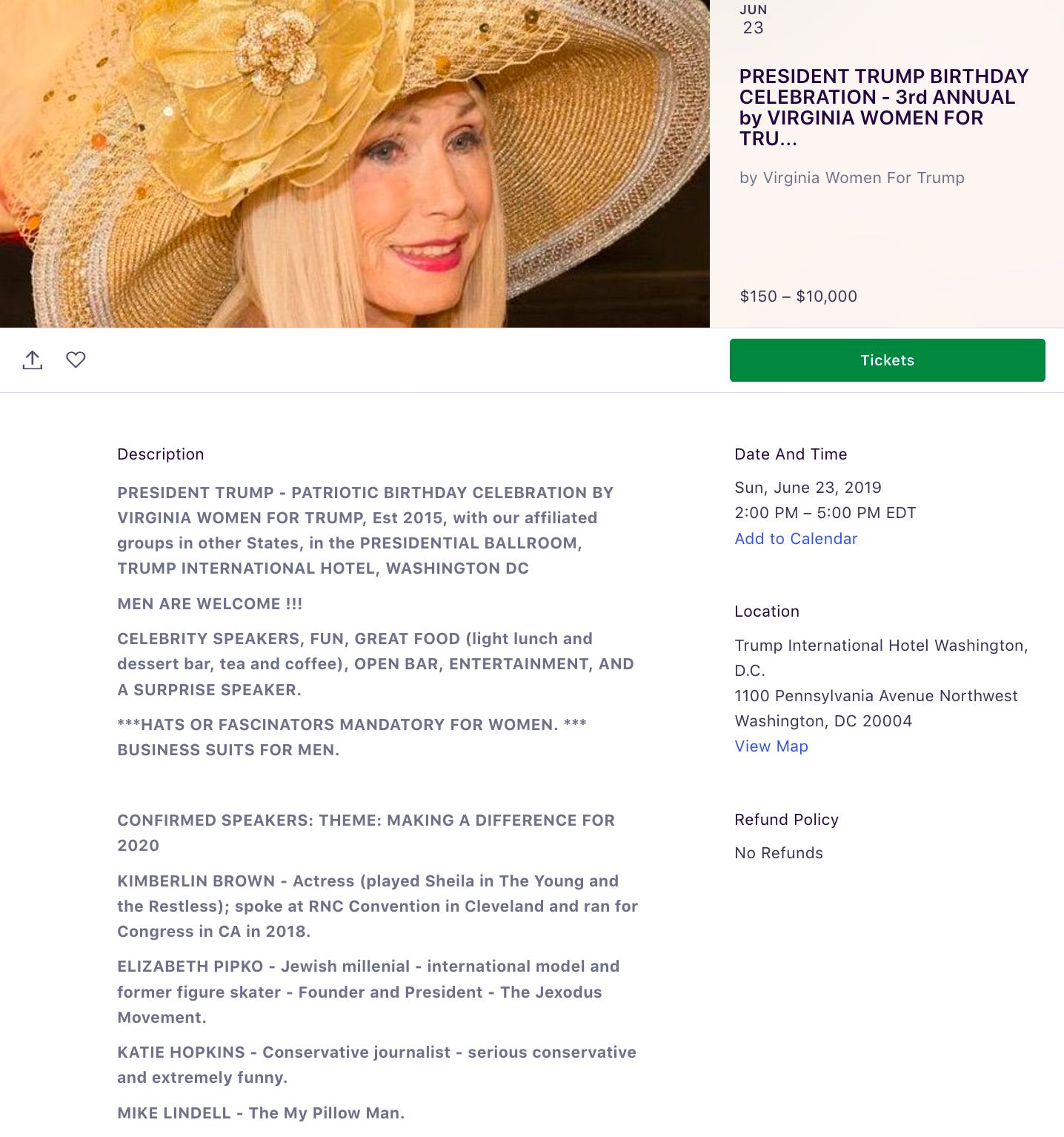 Virginia Women for Trump is throwing a birthday celebration for President Trump at the Trump Hotel D.C. on June 23. Ticket prices range from $150 for general admission to $10,000 for diamond sponsorships (which come with seats for 10).