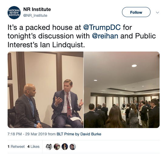 The National Review Institute’s discussion with Reihan Salam and Ian Lindquist packed them in at the president’s hotel. In February 2016, the National Review published a special issue titled, “Against Trump.”
