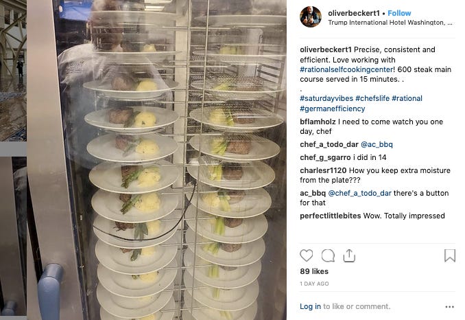 …likewise for the hotel’s catering business, which served 600 steak dinners on Saturday per the hotel’s executive chef, Oliver Beckert. According to a catering menu from March 2018, a three-course beef dinner costs $105 per person, meaning the president’s hotel likely charged at least $63,000 just to feed attendees at this event.