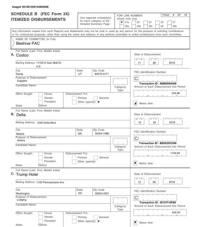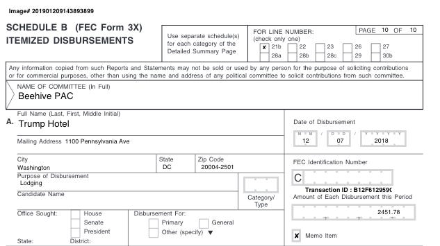 The Beehive PAC, affiliated with former Rep. Jason Chaffetz (R–UT), spent $2,881.28 on Dec. 6–7, 2018 for lodging.