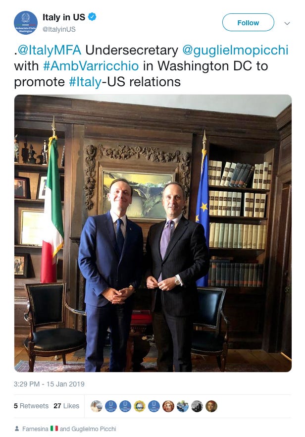 The Italian embassy in the United States’ verified Twitter account reports Picchi met with his country’s U.S. ambassador and was “in Washington DC to promote #Italy-US relations.”