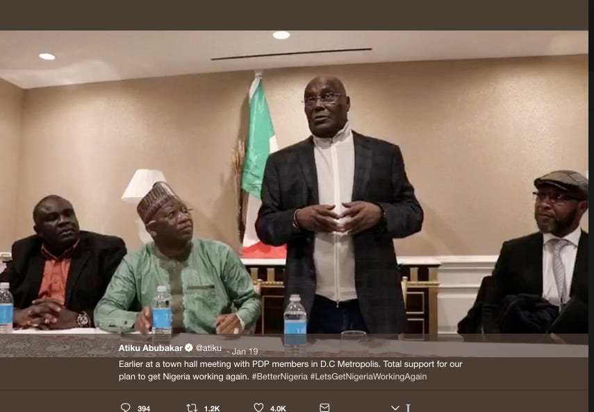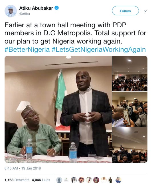 It appears Abubakar held additional meetings with Nigerian diaspora at the Trump Hotel D.C., based on his Twitter account sharing this photo before the town hall.