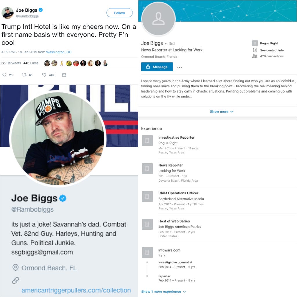Far-right media personalty, formerly of Infowars, Joe Biggs, boasted that he’s at the Trump Hotel D.C. bar so often its become his Cheers. Cool.