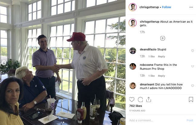 And, because why the hell not, Yang sported an American flag-themed Trump polo in photos posted July 23 and Aug. 6.