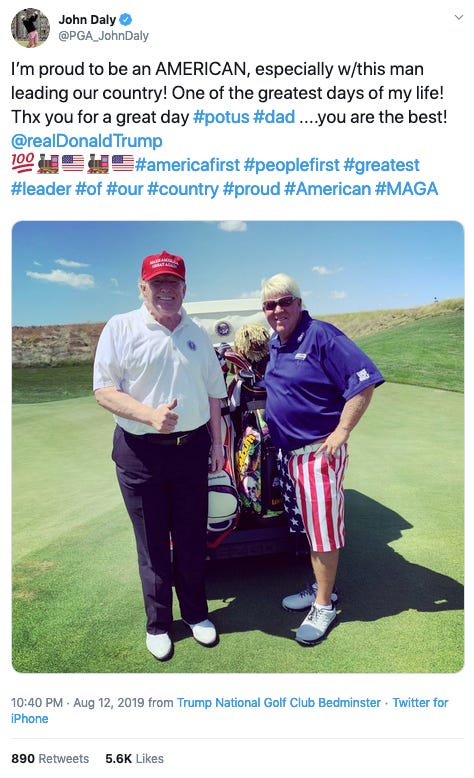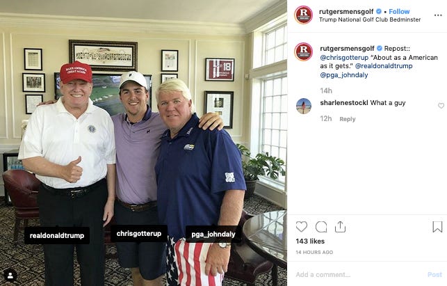 “It’s never a vacation, it’s working,” the president said a few weeks ago about his plans for his week-long August visit to his Bedminster club. Yesterday he golfed with PGA pro John Daly and posed for photo with Rutgers golfer Christopher Gotterup (his university shared the post).