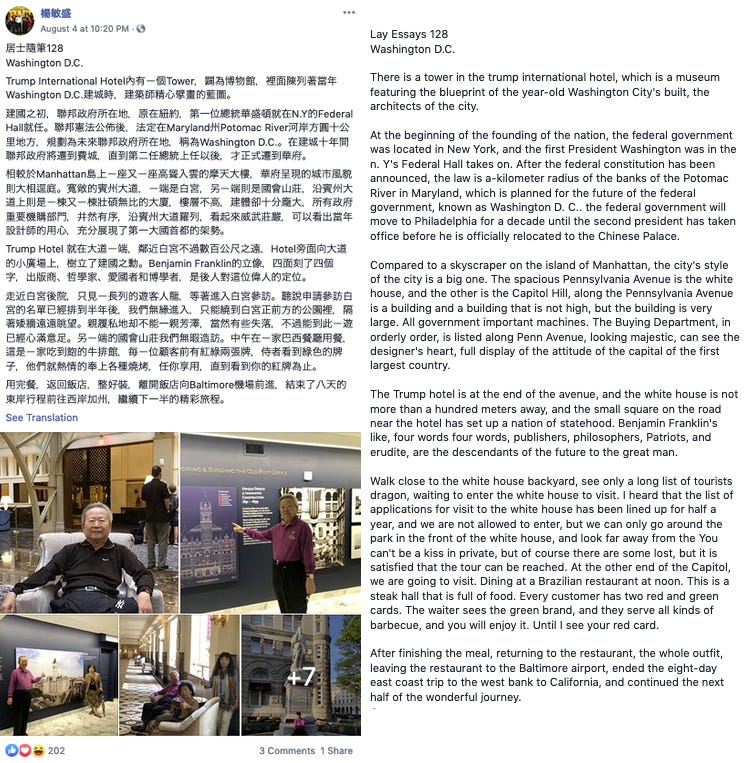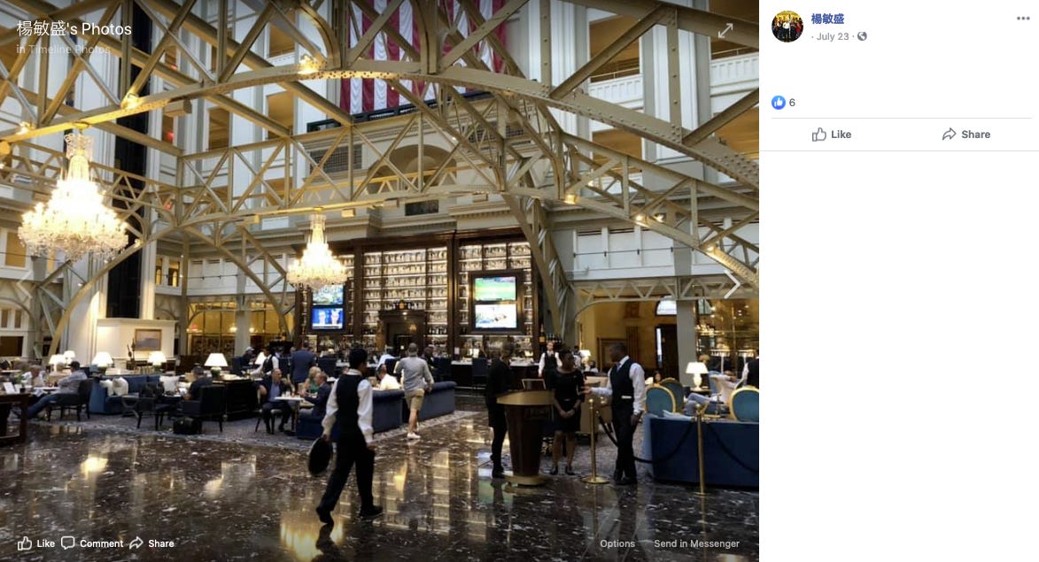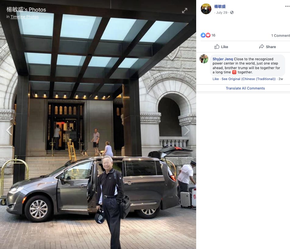 Yang’s Facebook posts came up in a search for pictures posted at the Trump Hotel D.C. in the past month. Googling his name turned up several news articles mentioning him, including the one pictured here, by a Taiwanese daily newspaper, China Times. Via Google Translate, that piece identified Yang’s role in the party (confirmed by several other media accounts) and included a photo, which enabled verification that he was the person at the Trump properties.