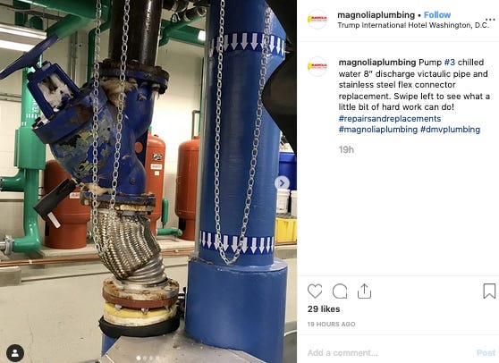 - Looks like Magnolia Plumbing just worked on the Trump Hotel D.C. That’s notable because on Dec. 21, 2016, Magnolia filed a $2.98 million lien against the hotel for “the unpaid balance for work done.” That lien got settled just before Trump’s inauguration—perhaps even at the behest of the then-president-elect himself.