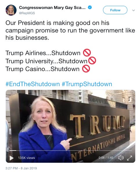 Yesterday Rep. Mary Gay Scanlon (D–PA) shared a video of her standing in front of the Trump Hotel D.C., demanding the president and Sen. Mitch McConnell (R–KY) end the government shutdown. Just elected to her first full-term, Scanlon used the location to point out that Trump’s promise to run the U.S. government like one of his businesses may not be desirable (executive summary: bankruptcies).
