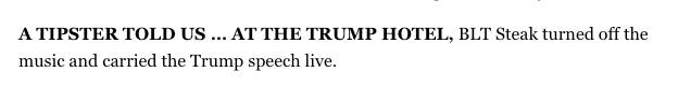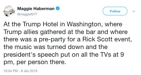 The president’s hotel cut its house music at the lobby bar so patrons could hear the president’s prime-time address from the Oval Office last night, according to both Maggie Haberman of The New York Times and Politico Playbook. The only other instance I can recall of the hotel nixing its boom-biddy-boom-biddy waa-waa evening atmosphere to air a speech was for last year’s State of the Union.