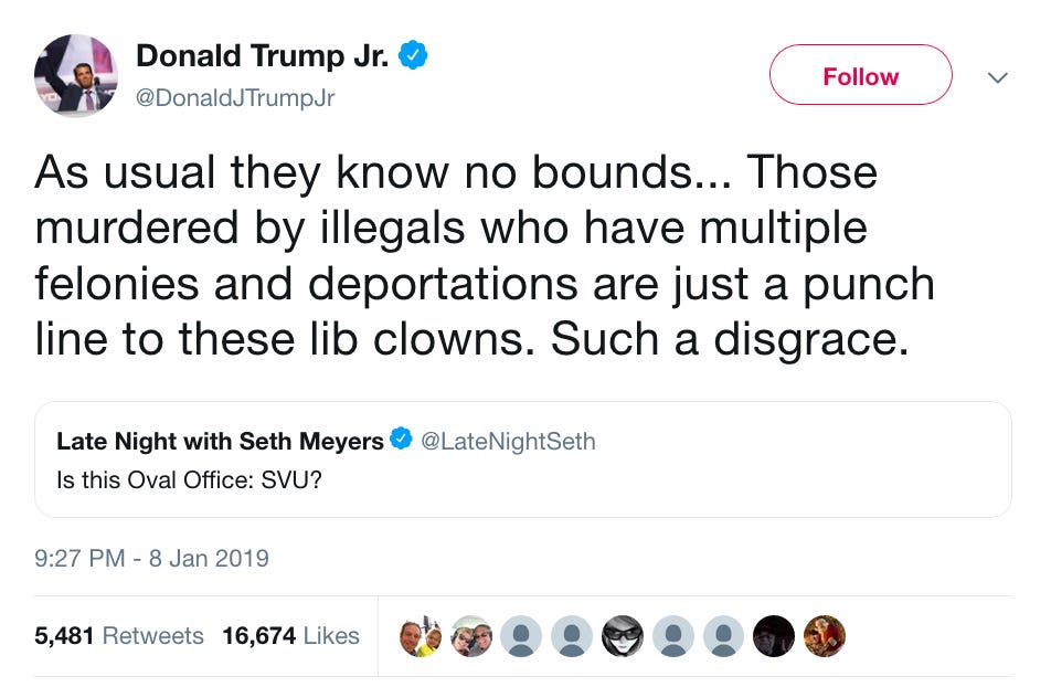 Donald Trump Jr., the EVP of an organization that employs undocumented workers, took to Twitter to complain about Seth Meyers not taking illegal immigration seriously.
