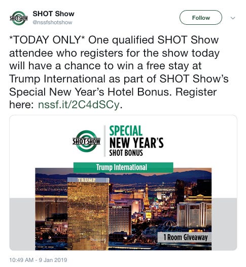 Attendees at the National Shooting Sports Foundation’s annual trade show for the shooting, hunting, and firearms industry have the chance to win a free stay at the president’s Las Vegas hotel.