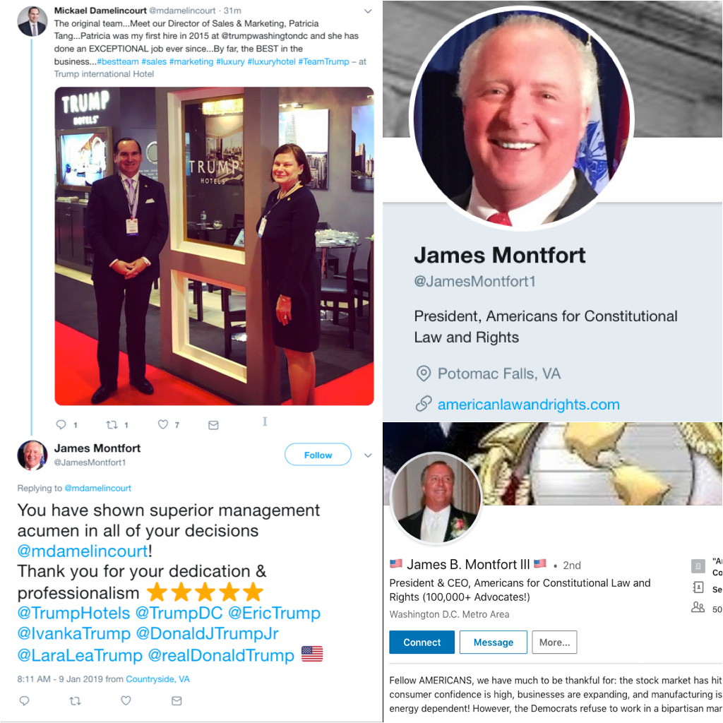 President Trump claims to be walled off from his business interests, but it appears his supporters/clients may not be aware of that separation. Here the president of Americans for Constitutional Law and Rights, James Montfort (a hotel regular), lets the U.S. president know that the managing director of his hotel does good work.