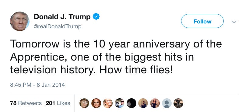 According to an old tweet from President Trump, today is the 15th anniversary of The Apprentice. (Fact check: Maybe! Other sources’ accounts make yesterday the anniversary.)