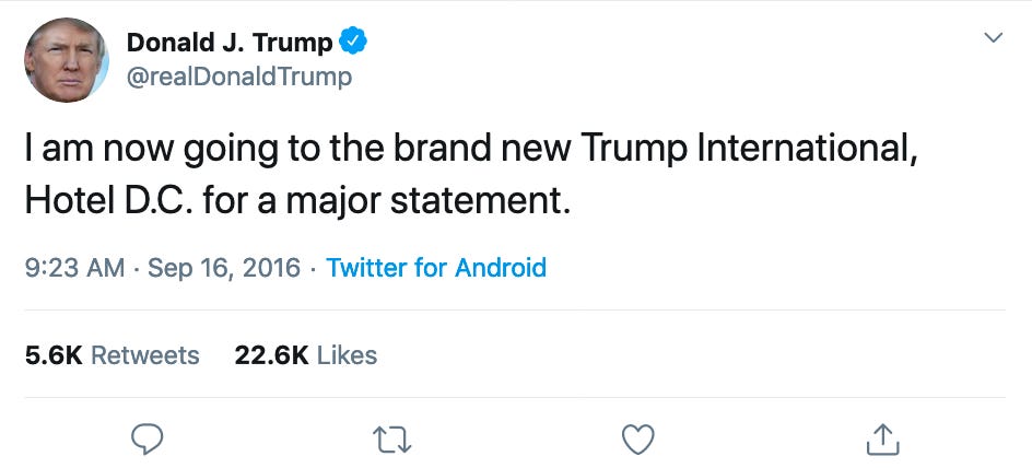 - Three years ago today, Donald Trump made a campaign stop at his new Trump Hotel D.C. My report from that day, for Fox News: “Already a success? Trump uses official DC hotel opening to plug brand triumphs.”