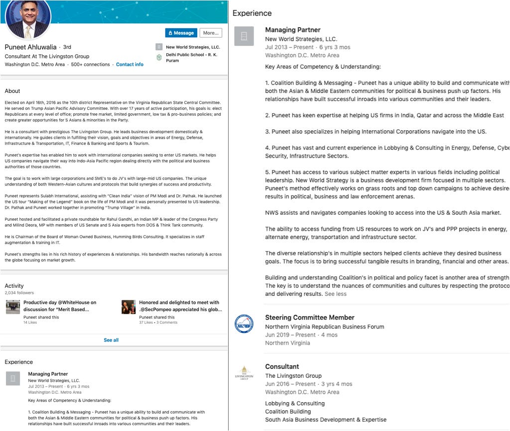 According to Ahluwalia’s Linkedin profile, he “leads business development domestically and internationally” for The Livingston Group “work[s] with international companies seeking to enter U.S. markets,” and has performed work on behalf of India’s Prime Minister Narendra Modi. Ahluwalia also headed the fundraising subcommittee for a Trump inaugural ball with ties to China and a Saipan casino where “thousands of dollars in donations flowed to an undisclosed source,” Lulu Ramadan of The Palm Beach Post reported in April.