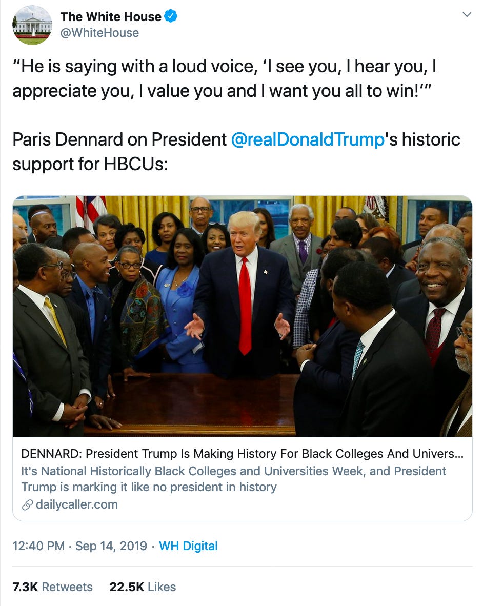 - The official White House twitter account promoted an article by a Trump Hotel D.C. regular who often plugs the president’s business on social media, Paris Dennard. Just last week, in fact, Dennard praised the hotel’s housekeeping. (Last year CNN suspended Dennard after The Washington Post reported he’d been fired from a previous job for alleged sexual harassment.)