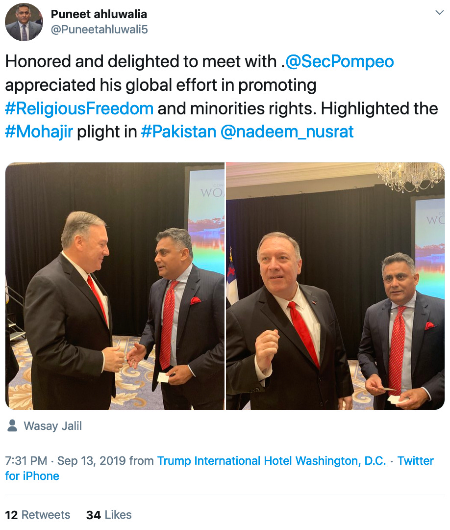 Pompeo was at his boss’s D.C. hotel for the Concerned Women of America’s 40th anniversary gala, where he was the lunchtime speaker. Puneet Ahluwalia—a consultant with the The Livingston Group lobbying firm, the managing partner of New World Strategies, and a district representative of the Virginia Republican State Central Committee—tweeted that he brought up with Pompeo the Mohajirs (also spelled Muhajir), a community of Urdu-speaking Muslims who migrated from India to Pakistan during partition and reportedly face persecution. Ahluwalia appears to have gained access to the United States’ top diplomat by attending a luncheon thrown by a paying client of the president’s business.