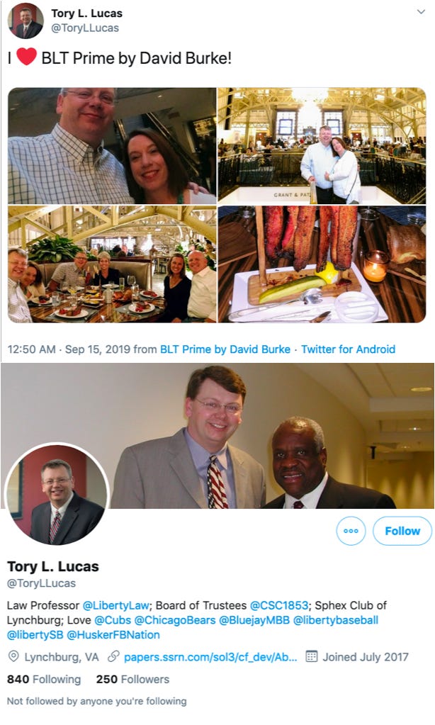 Tory L. Lucas, a law professor at Jerry Falwell Jr.’s Liberty University, wants the world to know he loves BLT Prime.
