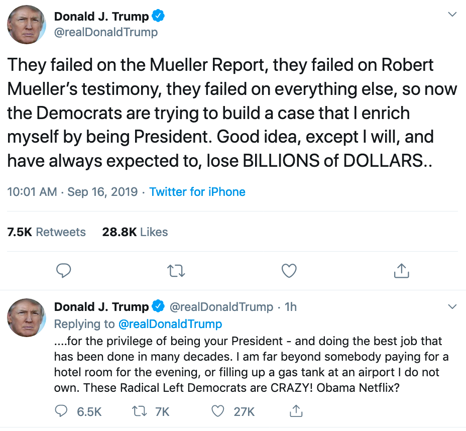 - This morning on Twitter, President Trump responded to House inquiries about how he’s profiting from his presidency.